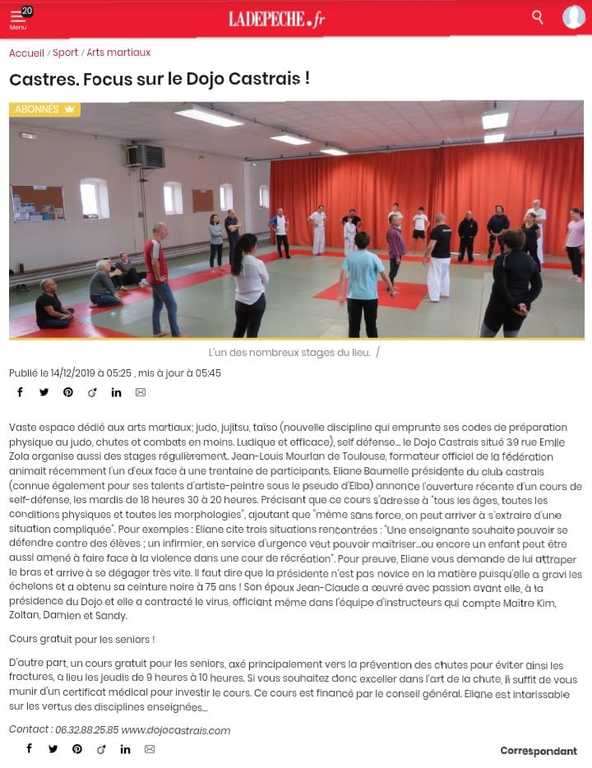 Article de La Dépêche du Midi du 14 Décembre 2019. Self Défense.